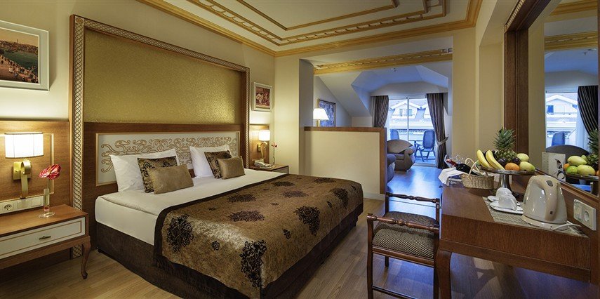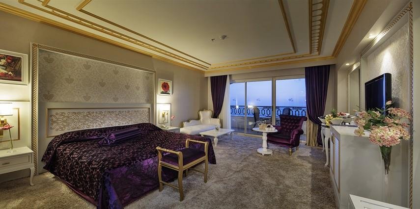 *Junior Suite: 44 m² genişliğindedir. Yandan deniz manzaralı olup, 1 yatak odası ve geniş oturma bölümü (120 cm yüksekliğinde ara bölme mevcuttur), Jakuzi küvetli veya duşlu banyo ve standart odaların tüm özellikleri mevcuttur. Maksimum 3 kişi konaklayabilmektedir. 50 Adettir.