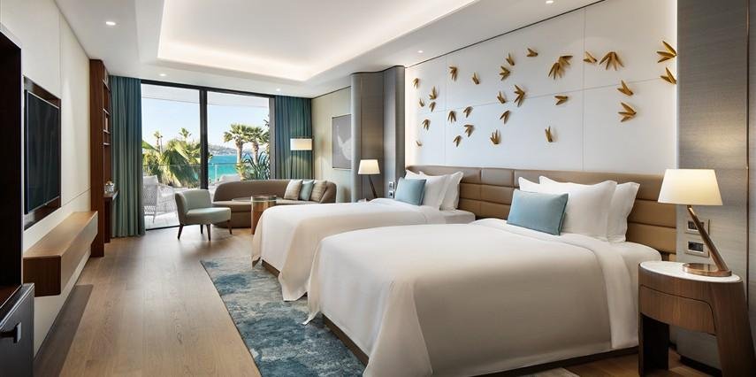 Tavandan zemine uzayan pencereleri sayesinde, tümü panoramik deniz manzarasına ve etkileyici genişliğe sahip 93 oda ve 11 süit, tesisteki genel huzuru vurguluyor. Şık ve modern en-suite banyolar, mermer tasarımı ve yağmur etkili duş ile Byredo imzalı ürünleri bir araya getirerek, geleneksel Türk bakış açısını yansıtıyor. Ultra modern düz ekran TV'lerden benzersiz düzeyde oda servisi sağlayan sezgisel sistemlere kadar en modern teknoloji, odalara gizlice entegre ediliyor.