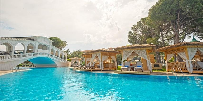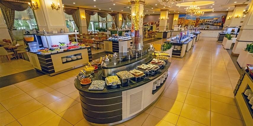 Sabah kahvaltısı öğle ve akşam yemekleri açık büfe olarak servis edilir, 24 saat Alkollü ve Alkolsüz yerli ve bazı yabancı içecekler (Türk Dünya markaları) ücretsizdir. Özel şampanyalar, markalı şaraplar, özel viskiler, konyak ve likörler ücretlidir. Tüm restoran ve barlarda içki içecek servisi kadehle yapılmaktadır . Konsepte dahil içecekler şişe olarak servis yapılmaz . Servis görevlisi belirli bir alkol tüketiminden sonra kendine ve çevresine zarar verebilecek misafire alkol servis etmeme hakkına haizdir . Tedarik kaynaklı marka ve ürün temininde değişiklik oluşabilir.